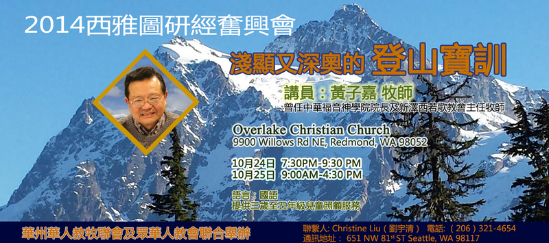 大西雅圖地區眾華人教會將於十月二十四日至二十五日聯合舉辦「2014西雅圖研經奮興會」。著名聖經學者、資深牧者黃子嘉牧師將前來領會。這次大型培靈奮興活動由華州華人教牧聯會主辦。